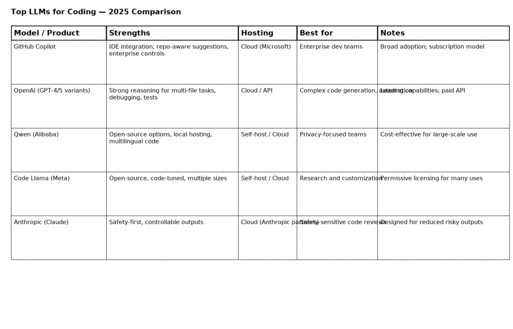 Open-source models gain operational share. As Qwen and Code Llama families mature, more teams will adopt local hosting to avoid per-token costs and to meet compliance or latency requirements. Expect richer third-party IDE integrations for these open models in 2025–2026.