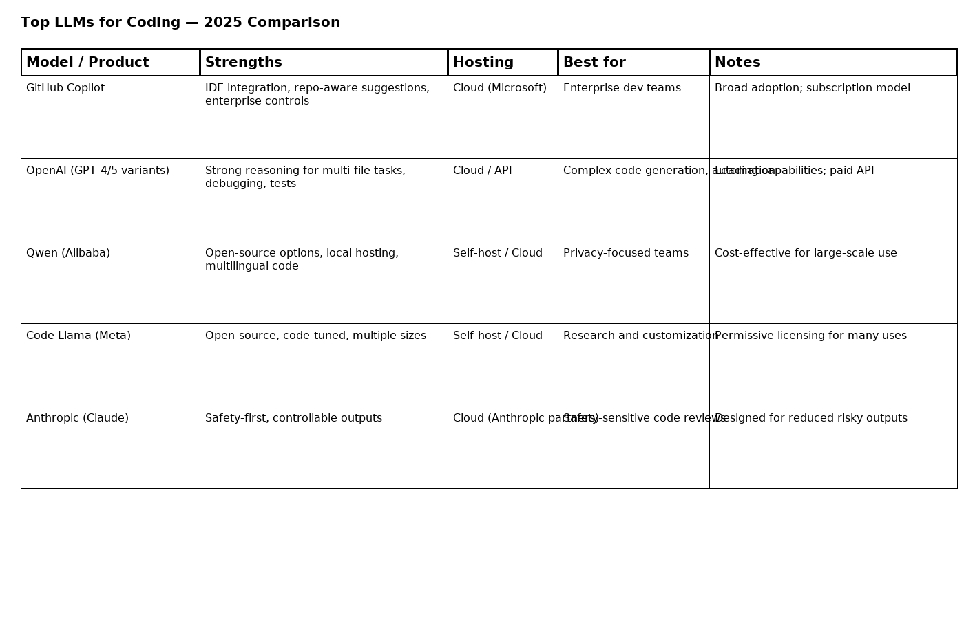 Those capabilities are delivered either as cloud-hosted APIs (typical for enterprise-grade offerings) or as local/open-source models you can self-host if you need privacy, low latency, or offline operation. (See the comparison below for specifics.) The landscape is moving rapidly — vendors push specialized “code” variants, and open-source projects are catching up with large, fine-tuned models that can run locally.