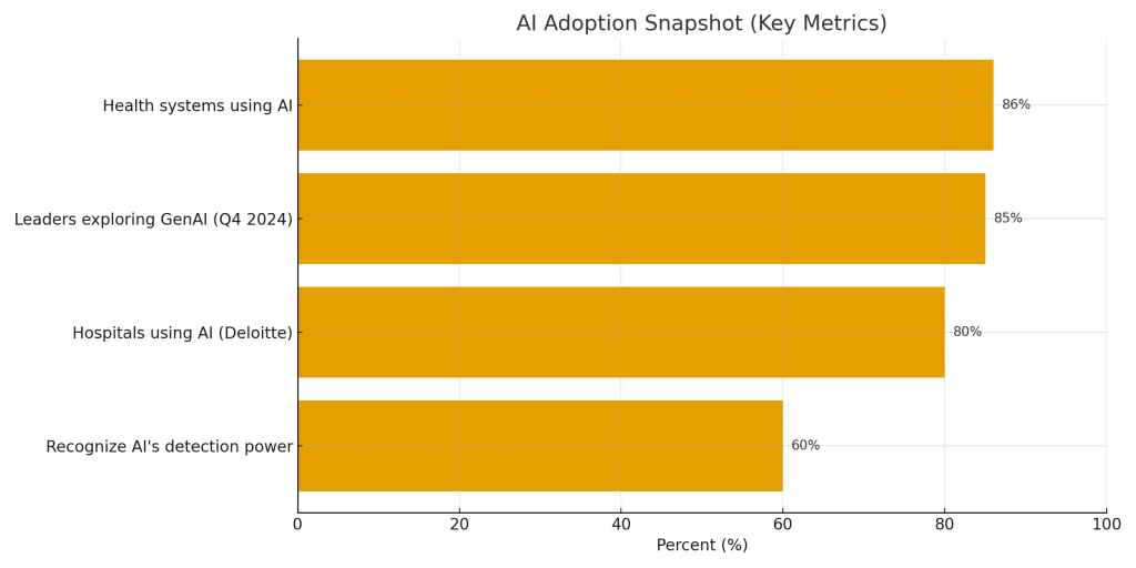 In a survey conducted in Q4 2024, 85% of healthcare leaders from payers, health systems, and healthcare services companies were exploring or had already adopted generative AI capabilities. This represents a dramatic shift from mere experimentation to large-scale implementation.