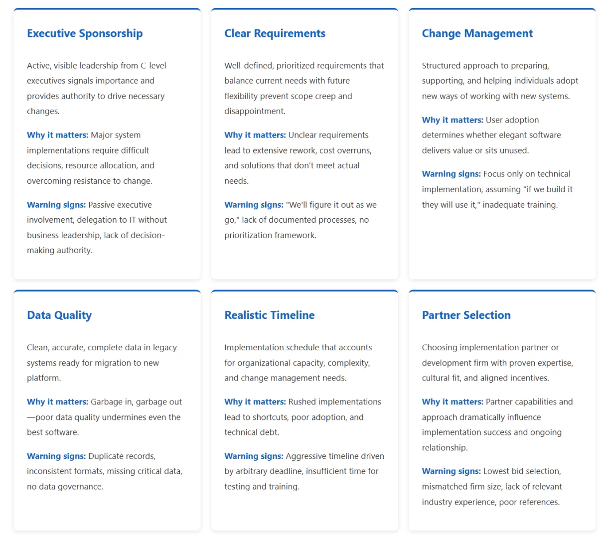 Regardless of whether you choose ERP, CRM, or custom development, certain factors consistently determine implementation success or failure.