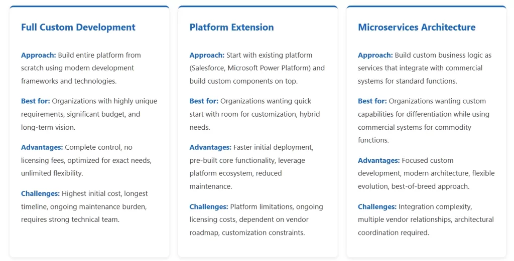 Organizations pursuing custom development have several architectural approaches to consider, each offering different balances of flexibility, speed to market, and long-term maintainability.