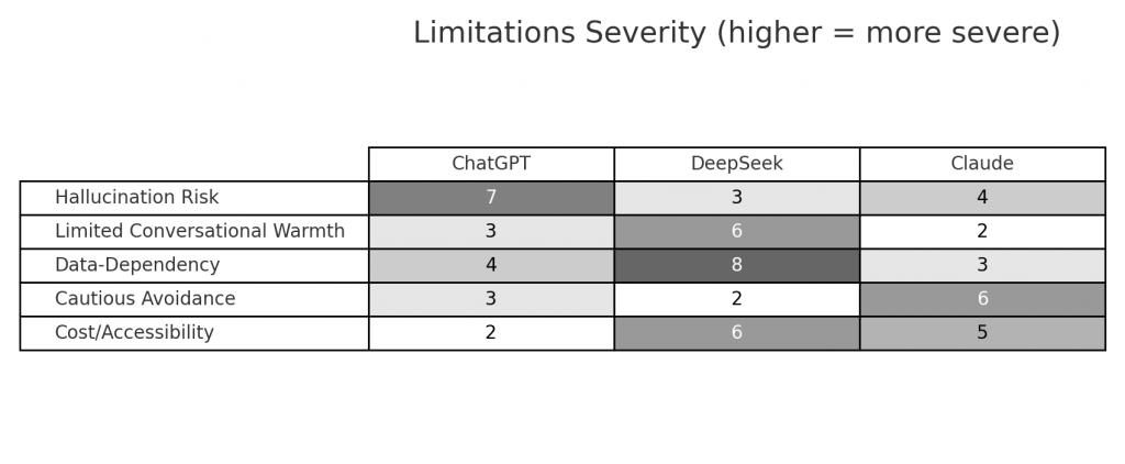 Verdict: Users seeking general versatility may tolerate ChatGPT’s occasional errors. For precision, DeepSeek’s limitations are a trade-off worth accepting. Claude’s cautious nature is beneficial but can frustrate users needing direct responses.