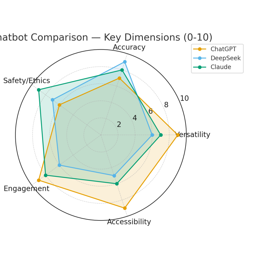 Verdict: For factual accuracy, DeepSeek outshines the others. ChatGPT remains strong for general-purpose conversational tasks, while Claude is reliable for sensitive or ethically complex situations.
