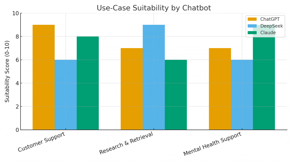 Verdict: ChatGPT excels in creative and customer-facing applications, DeepSeek is the go-to for research-intensive environments, and Claude fits best in sensitive or human-centric applications.