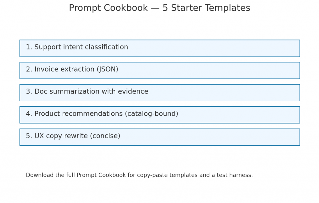 Below are five practical templates for common product workflows. Each includes a short description, prompt template, expected JSON schema and sample input/output.