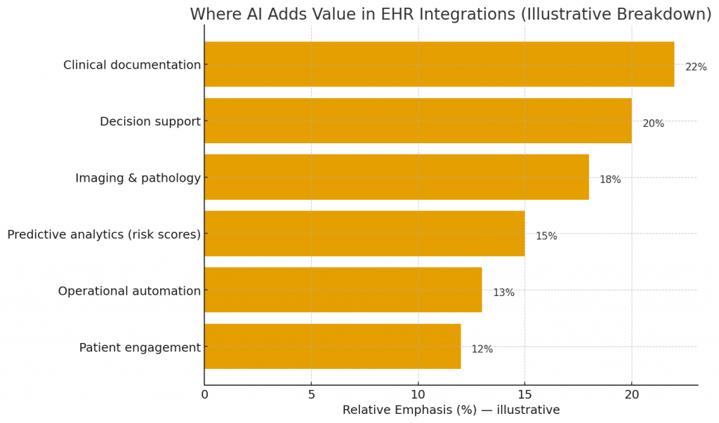 Primary integration points: clinical documentation, decision support, imaging & pathology results, predictive analytics (risk scores), operational automation (scheduling, coding), and patient engagement.