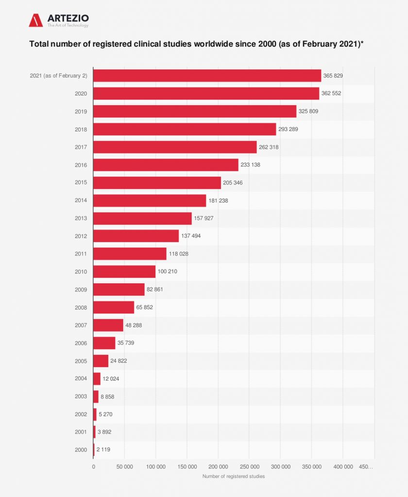 Another important development is the use of big data in clinical research. Thus, predictive modeling is possible which uses clinical and molecular data to develop safer and more efficient drugs. Particularly, real-time or real-world evidence (RWE) is becoming a greater interest. This is a particularly interesting statistic for us, as the use of big data in Healthcare is one of Artezio’s key market directions.