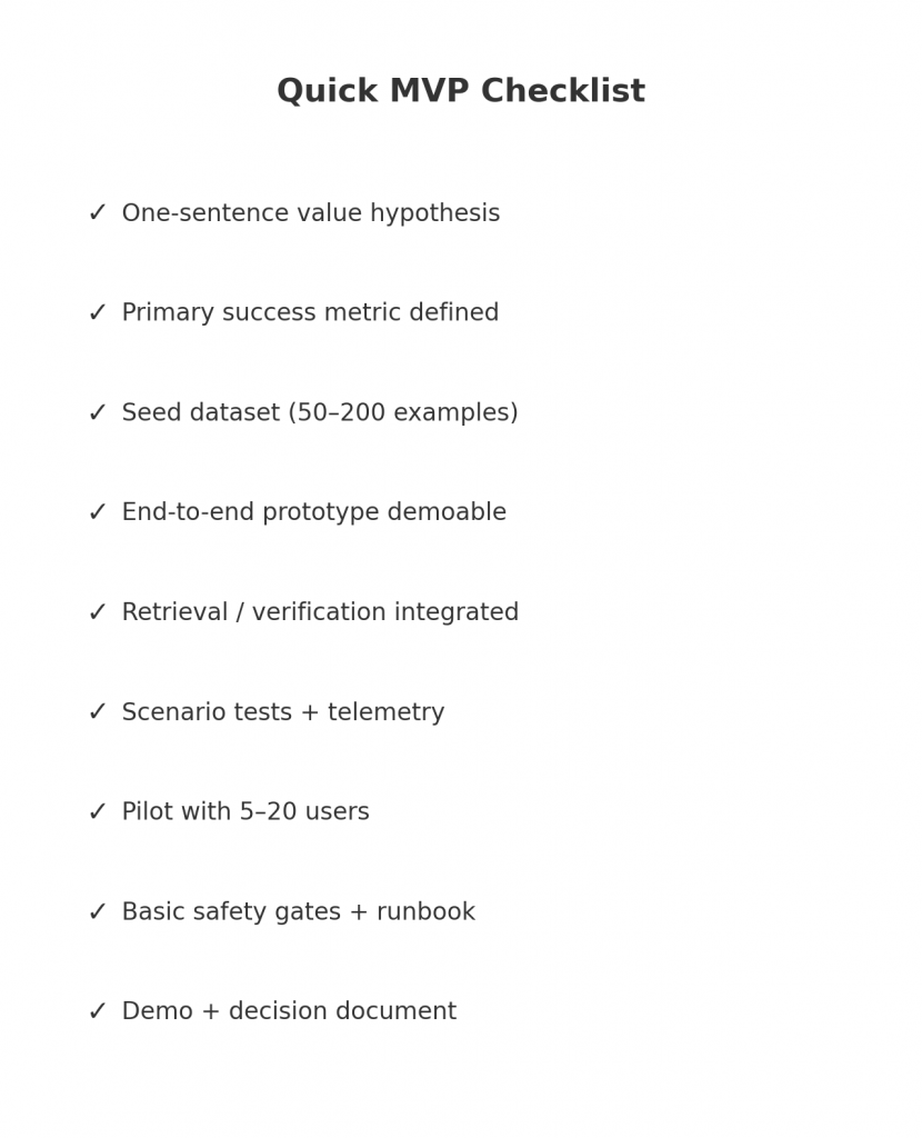 A one-week MVP is not a final product — it’s a rapid experiment to test a focused hypothesis. You will not ship a fully hardened, globally scalable system in seven days. What you will accomplish is far more valuable: a tested hypothesis, concrete user feedback, cost signals and a data-driven decision on whether to invest. That’s what product discovery is about.