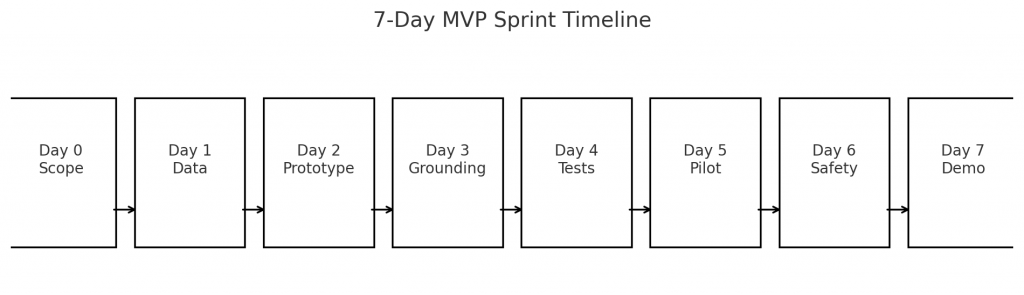 Day 0 (Prep / Scope): define the value hypothesis, success metrics, and minimal user journey. Final deliverable: one-page spec + sprint backlog.