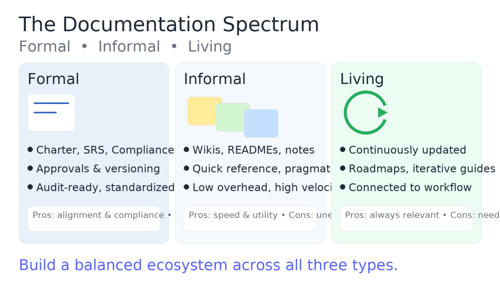 Informal Documentation: Quick references like wiki pages, README files, meeting notes, and Slack conversations. These emerge organically and focus on immediate utility.